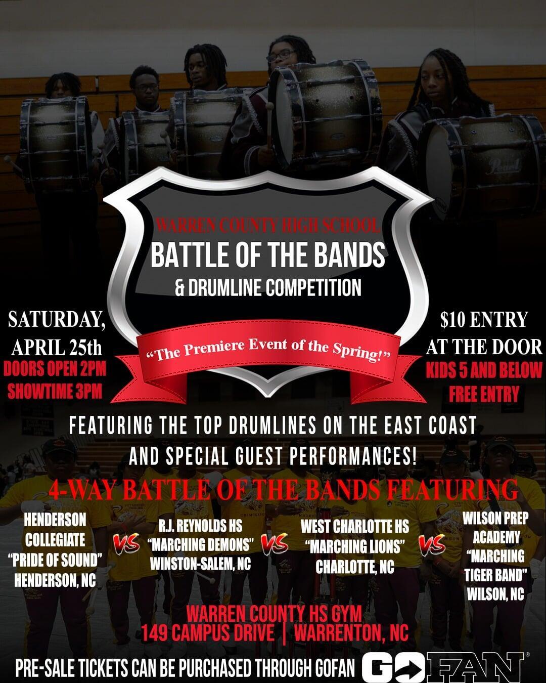 The 2026 Warren County HS Battle of the Bands & Drumline Competition is back, and the competition is hotter than ever! 10 drumlines, a host of exhibition performances, numerous vendors, and a 4-Way Band Brawl between four energetic marching bands that you are NOT going to want to miss! Order your tickets today to be in attendance for the true premiere event for the Spring!